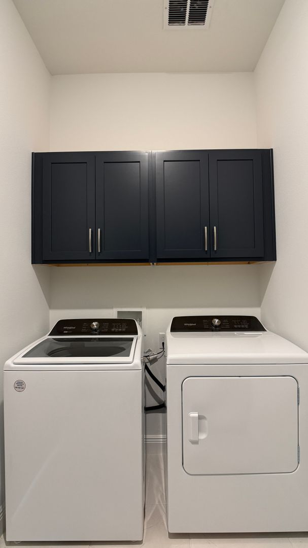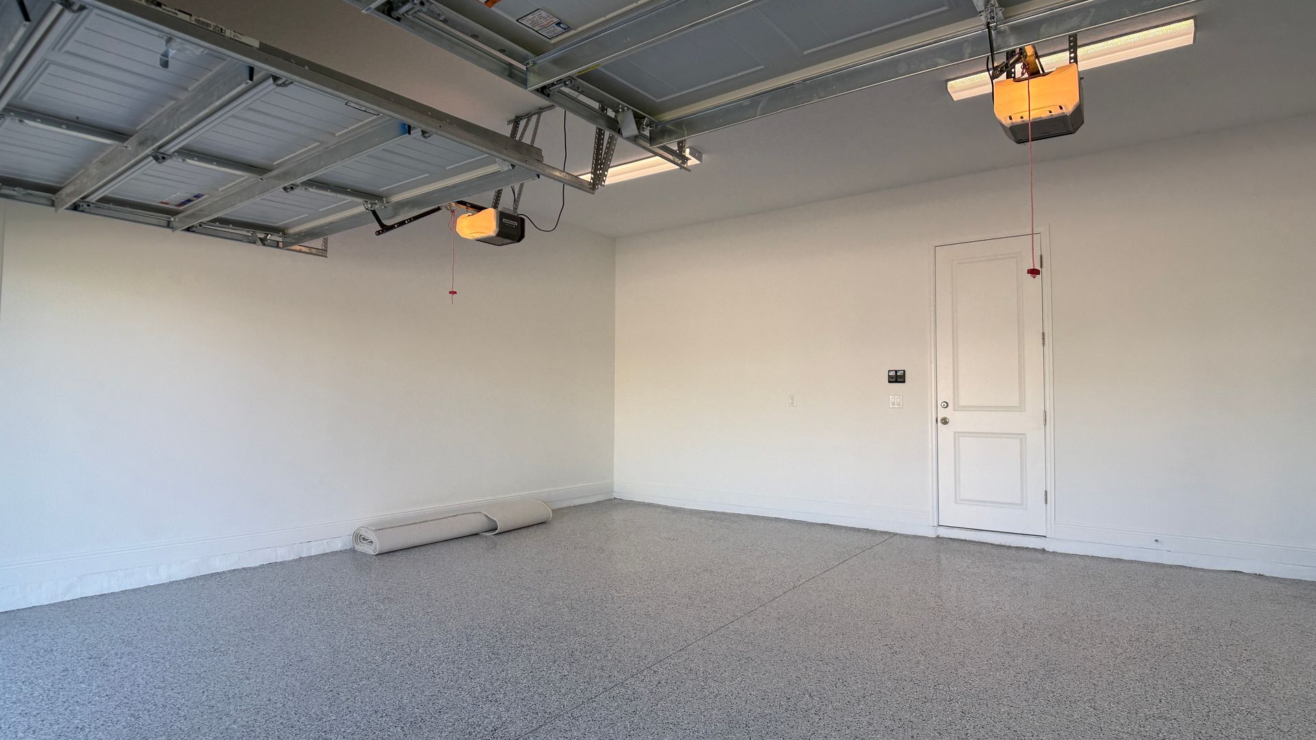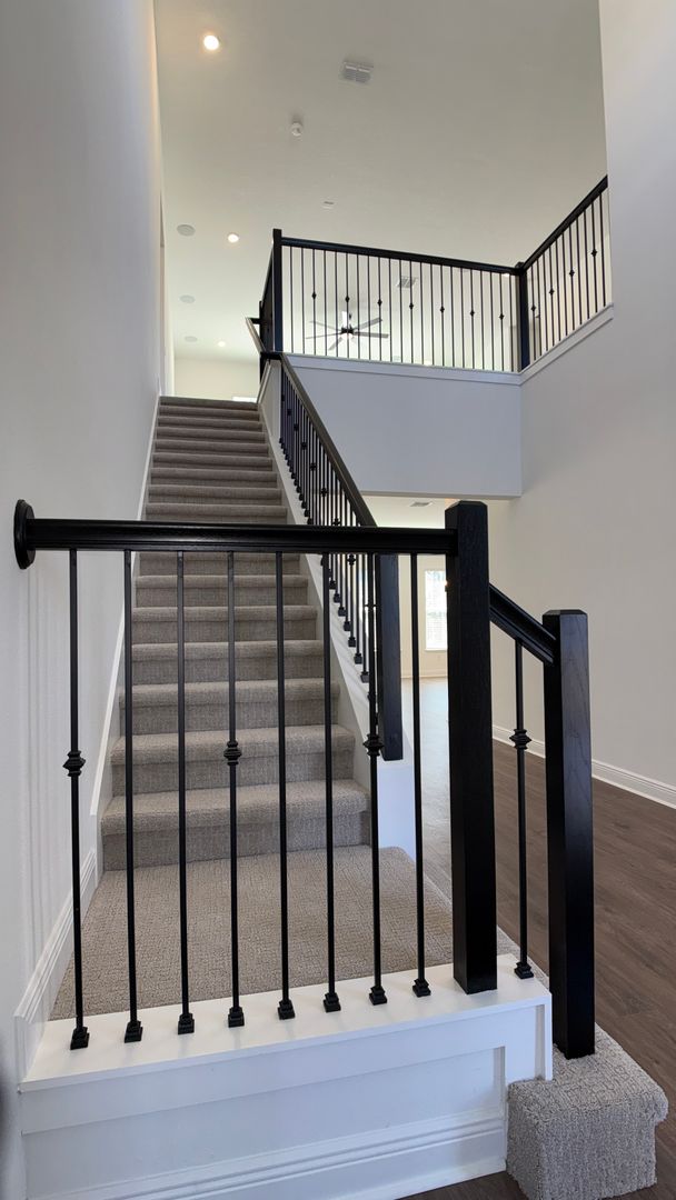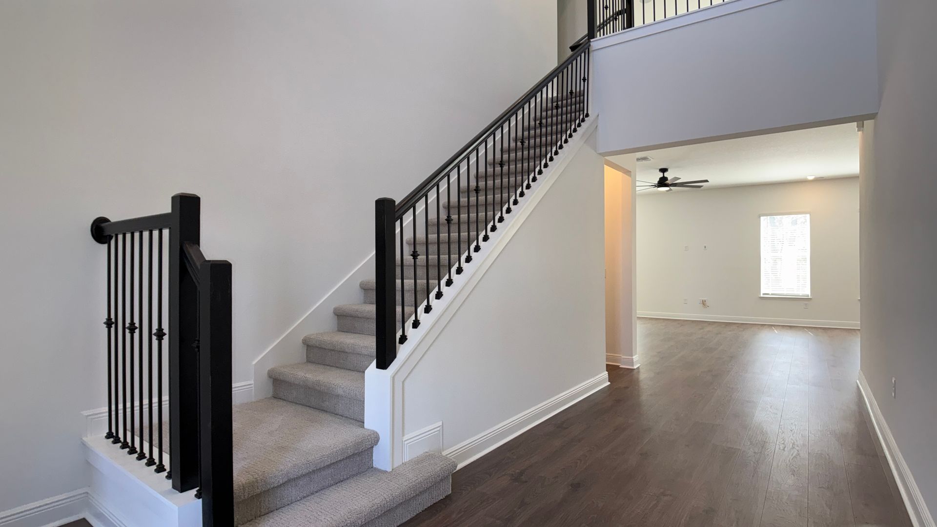 Other features include a striking metal-frame staircase, durable vinyl flooring on the first floor, plush carpet on the second, and a well-appointed laundry room with cabinets, a convenient sink, and washer and dryer. Smart home features include wired ceilings with built-in speakers for seamless entertainment.