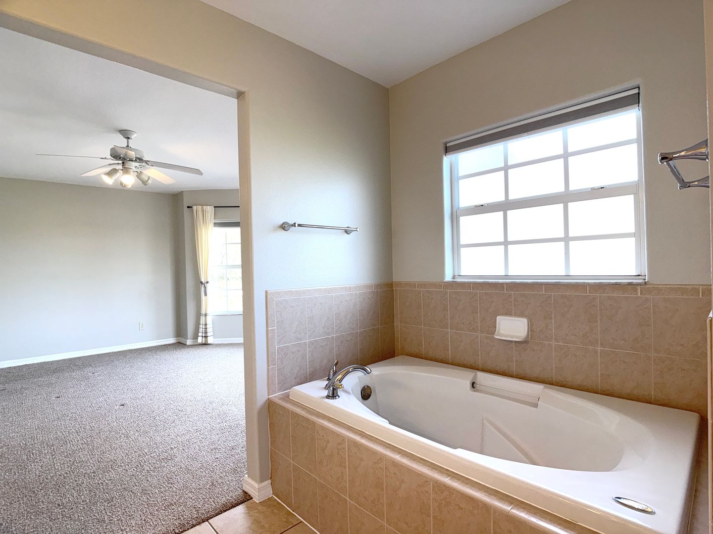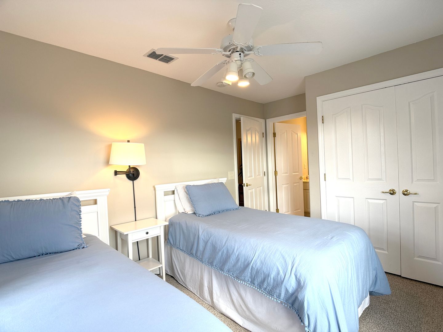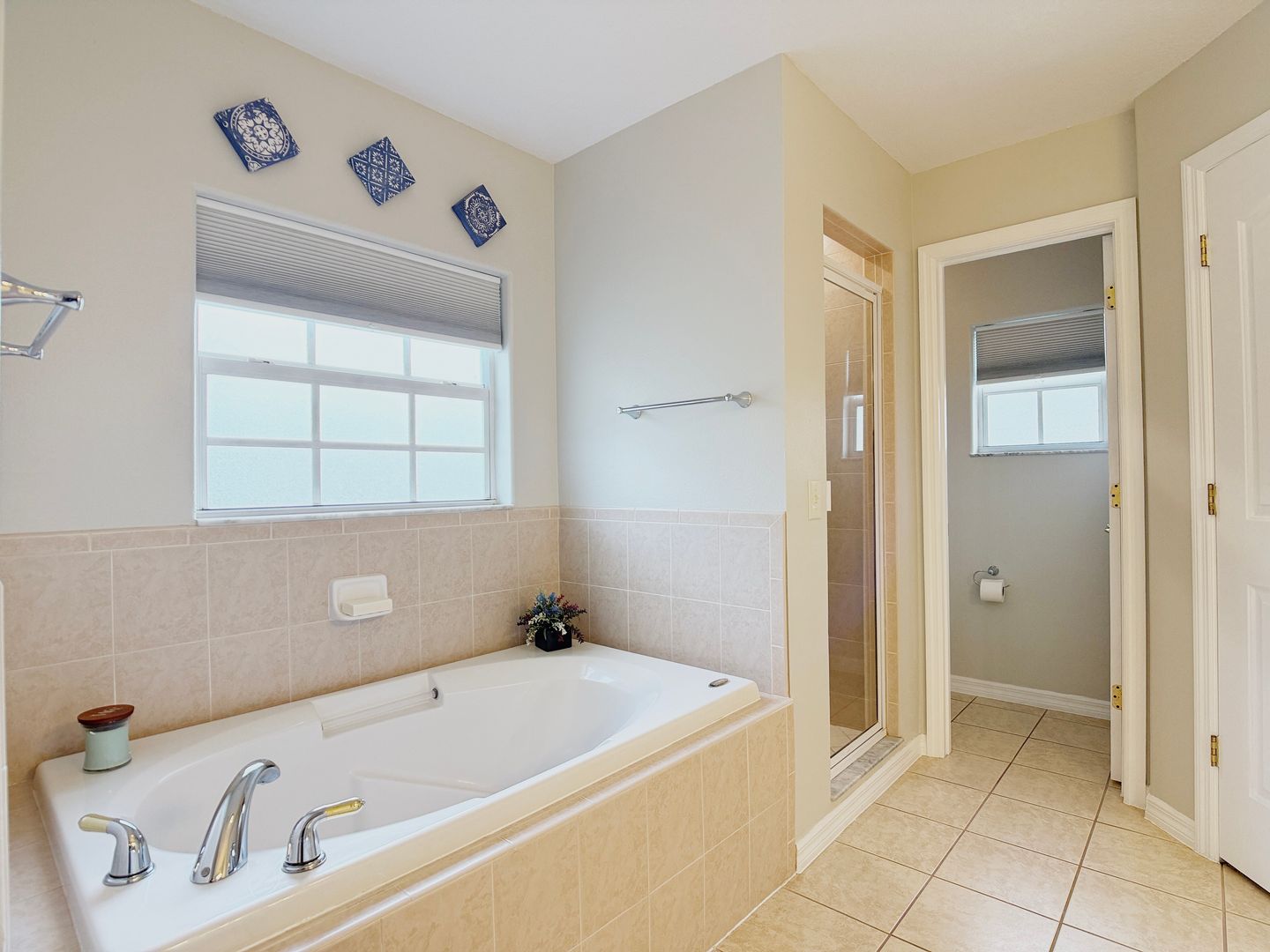 The home offers excellent bedroom flexibility, including two spacious primary suites upstairs, one with a private seating area. Both suites feature double-sink vanities, walk-in showers, soaking tubs, and separate water closets. An additional primary bedroom on the first floor is ideal for guests or multi-generational living.