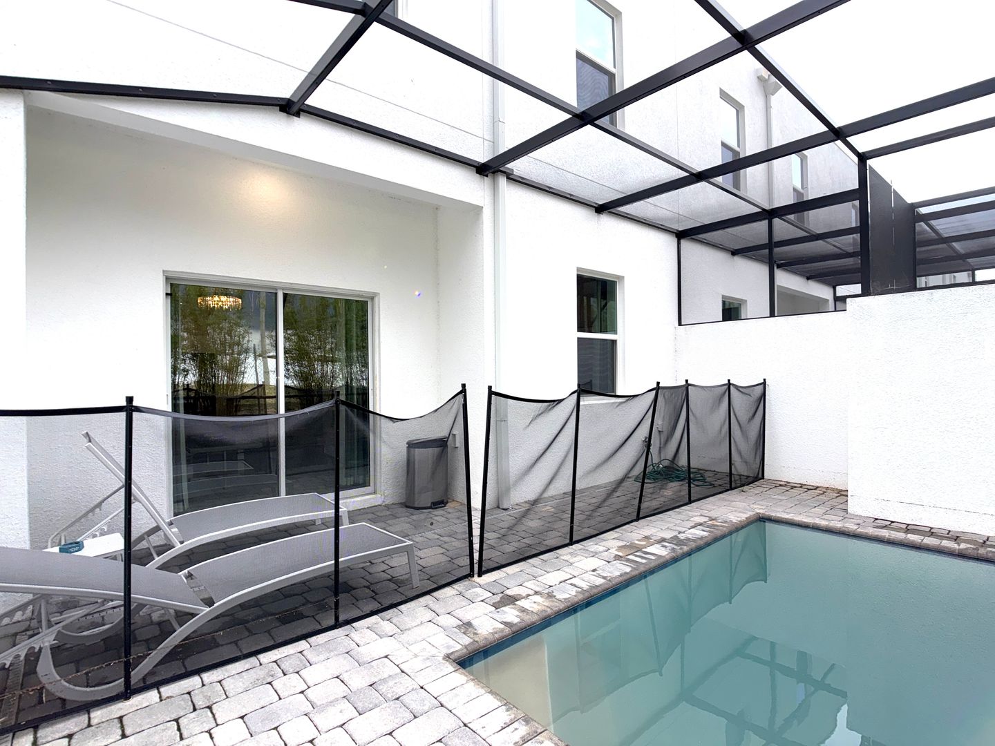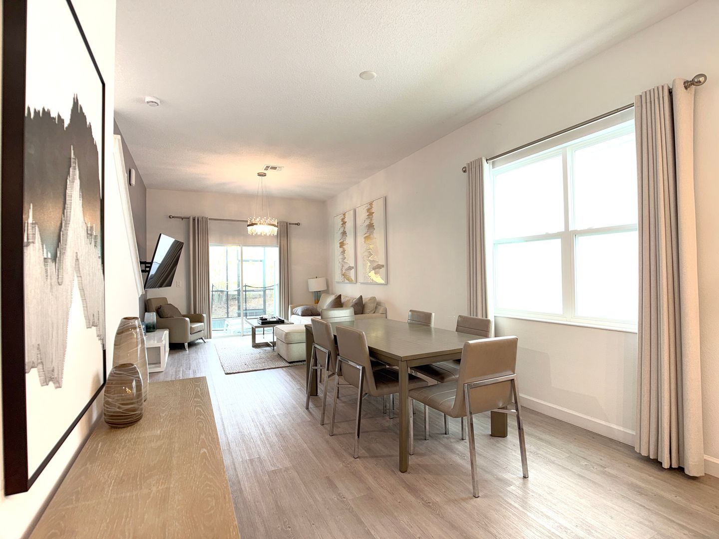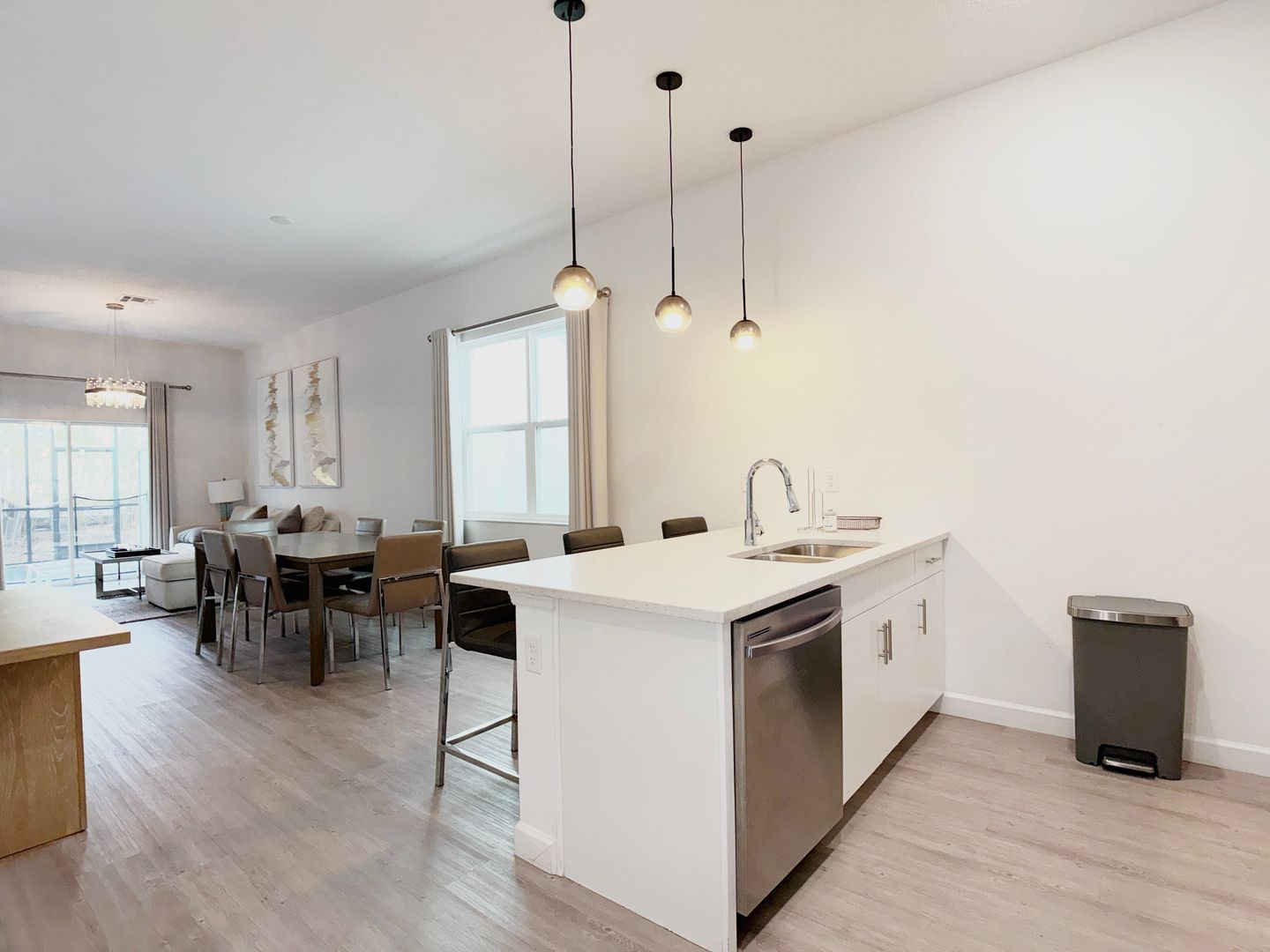 Fully Furnished & Move-In Ready – Lawn care, pool maintenance, and pest control are included in this stunning 5-bedroom, 5-bath townhome located in a secure, gated community. Modern comfort meets sleek, contemporary design throughout. The open-concept layout features a spacious great room connecting the kitchen, dining, and living areas—perfect for entertaining or everyday living. The kitchen is a minimalist dream, with slab cabinet doors, stainless steel appliances, stone countertops throughout, and a large island with seating. Two primary suites provide flexibility and luxury—one on the first floor with a double-sink ensuite, and the second on the upper level. Additional bedrooms are generously sized and beautifully decorated. A stackable washer and dryer on the second floor adds extra convenience. Step outside to enjoy a screened-in pool, paver deck, and plenty of space for lounging and relaxation. Residents of Azur Resort enjoy a state-of-the-art clubhouse, community pool, fitness center, and miniature golf. The location puts you minutes from Disney Parks, Champions Gate, Posner Park Mall, top restaurants, grocery stores, and entertainment options. With quick access to US-27, I-4, and Ronald Reagan Parkway, commuting and exploring Central Florida is a breeze. This home combines luxury, convenience, and resort-style living—schedule your showing today!